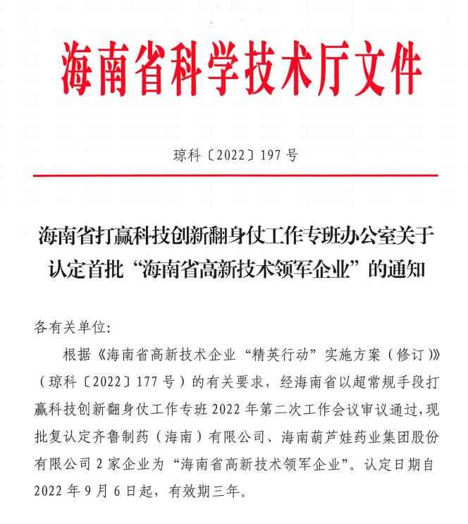 近日,海南省科学技术厅发布的《海南省打赢科技创新翻身仗工作专班办公室关于认定首批“海南省高新技术领军企业”的通知》中显示,批复认定海南BB视讯药业集团股份有限公司等2家企业为“海南省高新技术领军企业”。认定日期自2022年9月6日起,有效期三年。